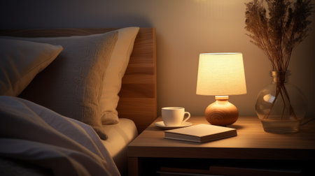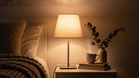 A lit lamp sits atop a nightstand next to a bed in a softly lit interior. The warm light illuminates the beige lampshade and nearby objects. Elements include a vase with greenery, books, and a mug. The photograph may be suitable for home decor or lifestyle publications.