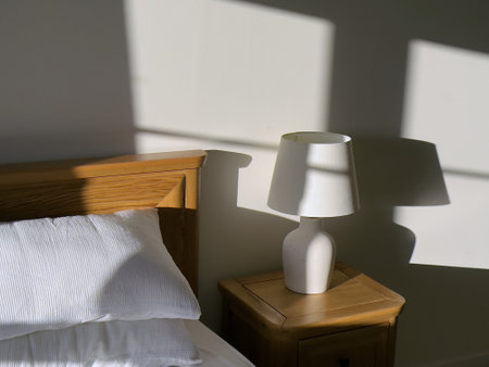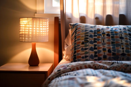 Cozy and inviting, this room features a warm bedside lamp casting gentle shadows on a patterned pillow. A peaceful sanctuary for rest. Generated A.I.