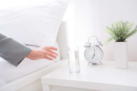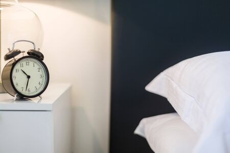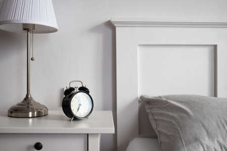 Image alarm clock with a black cup of coffee on a white bedside table in front of the bed with gray linens. The room is in beige tones.