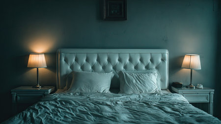 This interior shot features a meticulously arranged bed with soft pillows and a textured blanket. Two lamps flank the bed, casting a warm glow against the neutral-toned walls. The overall ambiance is tranquil with subtle shadows suggesting an evening setting, perfect for various commercial applications.
