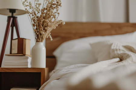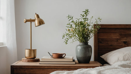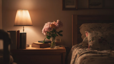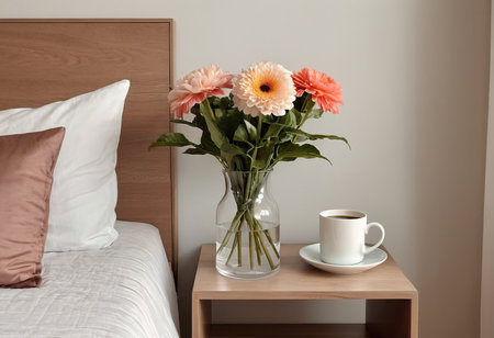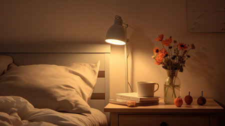 Cozy bedroom corner with warm lighting, a vase of flowers, and a cup of coffee on a wooden nightstand