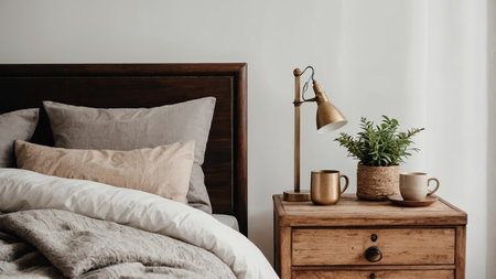 Cozy bedroom setup featuring a wooden bed, bedside table, and relaxing decor in a warm ambiance