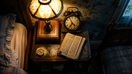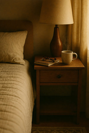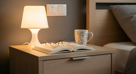 A cozy nightstand scene featuring a lit lamp, an open book with reading glasses, and a mug. The warm lighting creates a relaxing atmosphere perfect for evening reading in a bedroom.