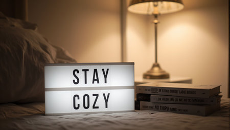 Cozy bedroom scene with Stay Cozy lightbox books and soft lamp glow