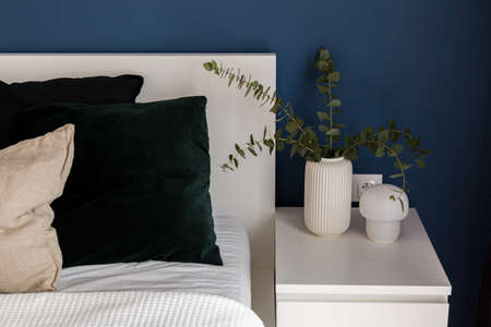 White bedside table with decorative lamp and vase with eucalyptus twigs next to cozy bed in bedroom with navy blue wall