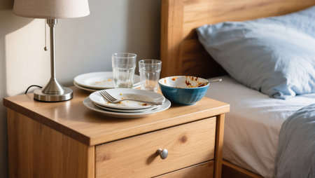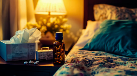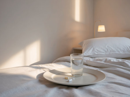 AI Generated. Medicine and water on a plate beside a bed in a softly lit bedroom during morning hours