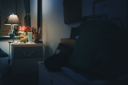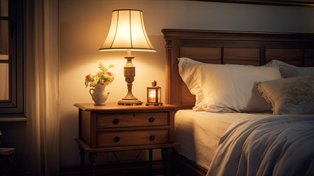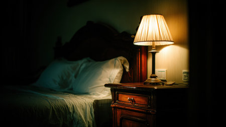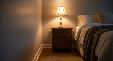A serene nightstand scene featuring a glass of water, a lamp casting soft light, and medication, ideal for depicting a restful nighttime atmosphere.