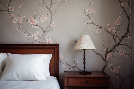 Close-up image of the simple wallpaper with flower pattern in the bedroom or hotel room.