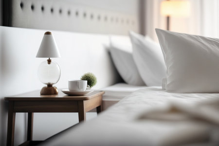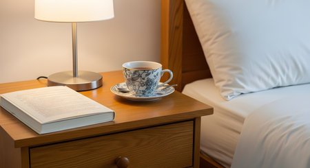 A cozy bedroom scene featuring a wooden nightstand with an open book and a cup of tea under a warm lamp. The clean white bedding and soft lighting create a relaxing atmosphere perfect for reading and rest.