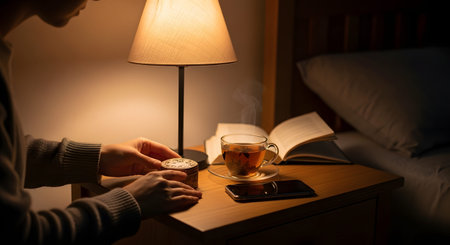 A person's hands reach for a small decorative box on a wooden nightstand illuminated by a warm lamp. A cup of steaming tea, a smartphone, and an open book create a cozy and relaxing evening atmosphere.