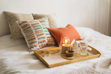 Linen pillows on a white bed with home decor. Still life details in home on a bed. Cozy home.