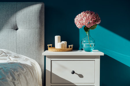 Stylish modern cosy bedroom in dark colors. Cozy interior with turquoise walls, home decor. Bed with grey fabric headboard, white blanket, bedside table, vase with pink hydrangea flower, candles.