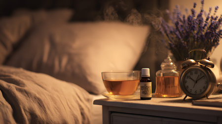 A bedside table with herbal tea, essential oil, glass jar, alarm clock, and lavender bouquet creates calming, healthy sleep routine atmosphere