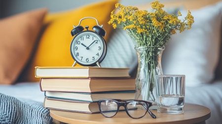 Modern digital alarm clock next to a stack of school books on bedside table, morning light shining through, peaceful back to school morning mood