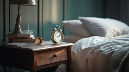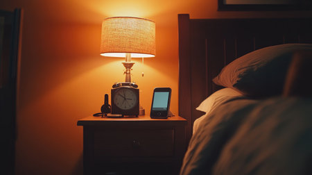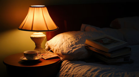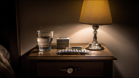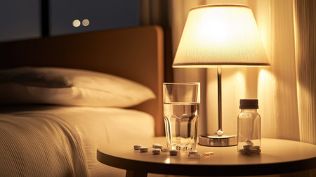 A serene bedside scene featuring a glass of water, pills, and a warm lamp, capturing a sense of tranquility and comfort for restful nights.