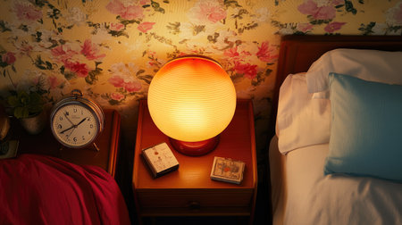 A cozy bedroom scene featuring a warm, glowing lamp on a nightstand next to a vintage clock. Floral wallpaper adds a charming touch, creating a relaxing atmosphere.