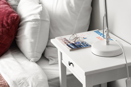 Dust-free bedside table with phone, lamp, and alarm clock neatly placed
