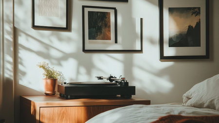 A serene bedroom scene showcasing a vintage turntable with a potted plant and framed art, illuminated by warm light and casting soft shadows, creating a tranquil atmosphere.