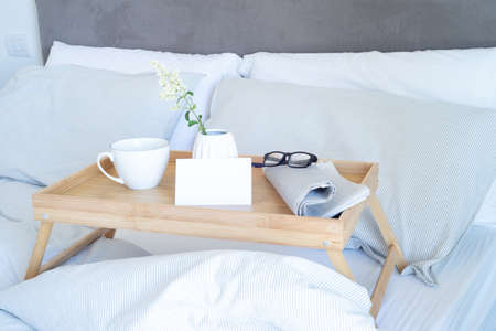 Breakfast in bed stationery mockup scene. Blank greeting card mockup, cup of coffee, newspaper and glasses on tray. White vase with small flowers. Valentine's day breakfast, lifestyle concept.