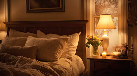 A cozy bedroom scene featuring a neatly made bed with pillows and a warm lamp light casting a soothing glow, inviting relaxation and peace.