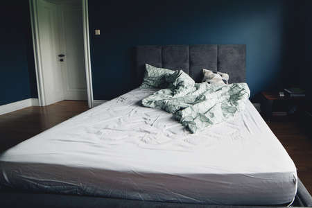 Dark blue color bedroom interior design. Unmade bed in the room. Minimalism, interior, comfort and bedding concept. Bed at home bedroom. Empty bed in morning time.