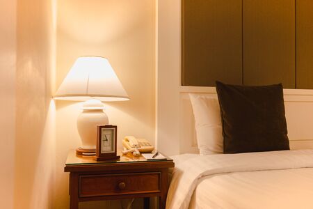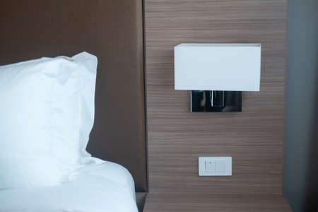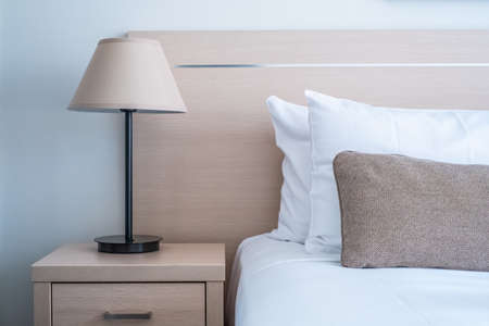 Crop shot of bedhead with table lamp on side table. Bedroom interior decorated with cozy design, white bed sheet and pillow with brown small pillow and light beige color on bedhead. Relax and rest.