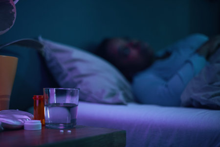 Person lying in bed under soft, blue-hued lighting with a glass of water and pill bottles on a bedside table. Relaxing evening scene with focus on health and rest