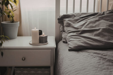 A serene bedroom scene featuring a nightstand with candles and a plant next to a neatly made bed.