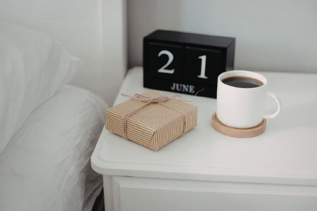A serene morning scene featuring a cup of coffee, a gift, and a calendar on a bedside table.
