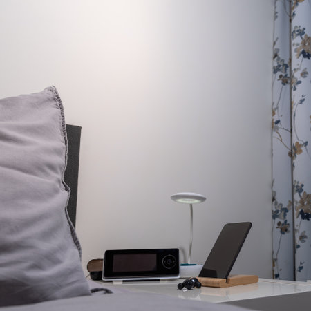 bedside table with lamp, smartphone, headset and clock. square format