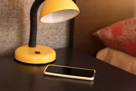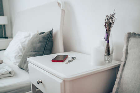 bedroom in summer with smartphone and lamp on the nightstand next to the bed