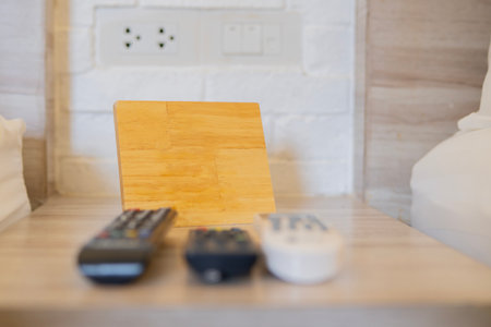 Wooden empty board setting on wooden nightstand nearby with TV remote in hotel bedroom. Hotel accommodate concept.