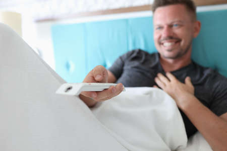 Man lies in bed and laugh. Person hold white TV remote control in his hand and switches channels