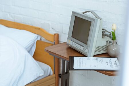 bed, medical equipment, flower and clipboard in clinic