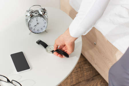 Cropped view of businessman taking wristwatch from bedside table near smartphone and eyeglasses