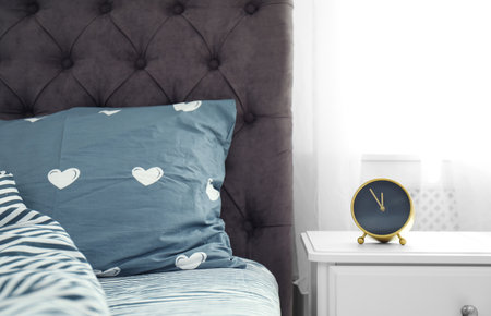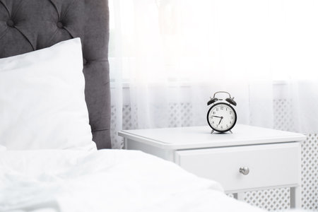 Analog alarm clock on table in bedroom. Time of day