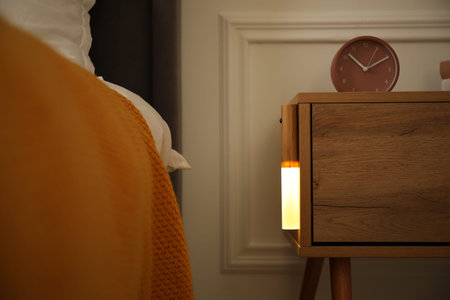 Stylish lamp and alarm clock on bedside table indoors. bedroom interior elements