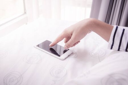 Hand using are holding smart phones. charger is plugged on the white bed, The danger of charging electricity when sleeping.