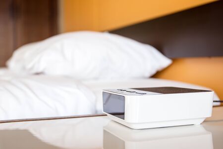 Digital alarm clock on the white desk beside a bed close up.