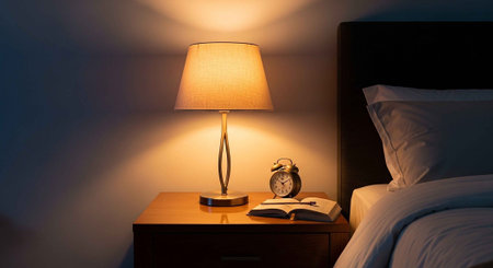 A cozy bedroom scene with a bedside lamp and alarm clock