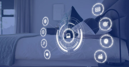 Digital interface icons image over person using laptop on bed.
