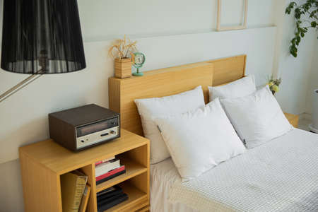 Modern bedside fabric table bed lamp light bulb on wooden table in cozy bedroom and white fabric pillows interior beautiful living room decoration for home