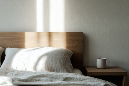 A serene bedroom scene featuring a bed bathed in soft morning light, complete with a bedside table, mug, and book, creating a cozy and inviting atmosphere for relaxation.