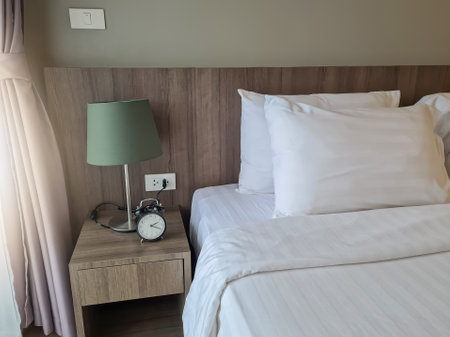 Dust-free bedside table with phone, lamp, and alarm clock neatly placed