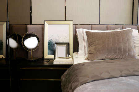 Stylish lamp and magazine on bedside table indoors. bedroom interior elements