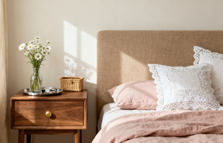 Cozy bedroom corner with warm lighting, a vase of flowers, and a cup of coffee on a wooden nightstand