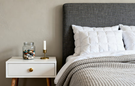 An Elegant Bedroom Featuring a Modern Nightstand and Stylish Decorative Elements Throughout