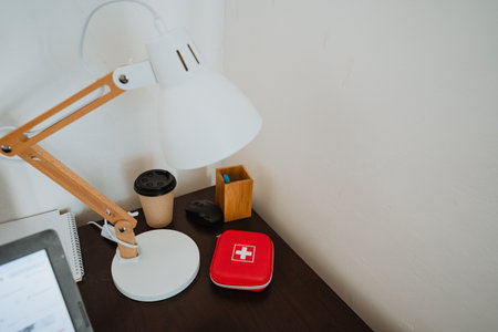 This stylish workspace features a contemporary lamp, a cozy coffee cup, and a compact first aid kit, creating a functional atmosphere that enhances productivity and comfort