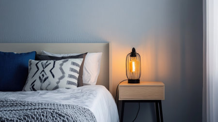 Interior of a modern bedroom with a bed and a table lamp