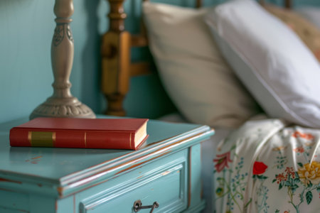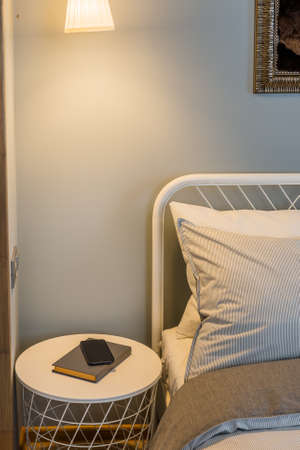 Lamp and book on bedside table in bedroom, interior design concept